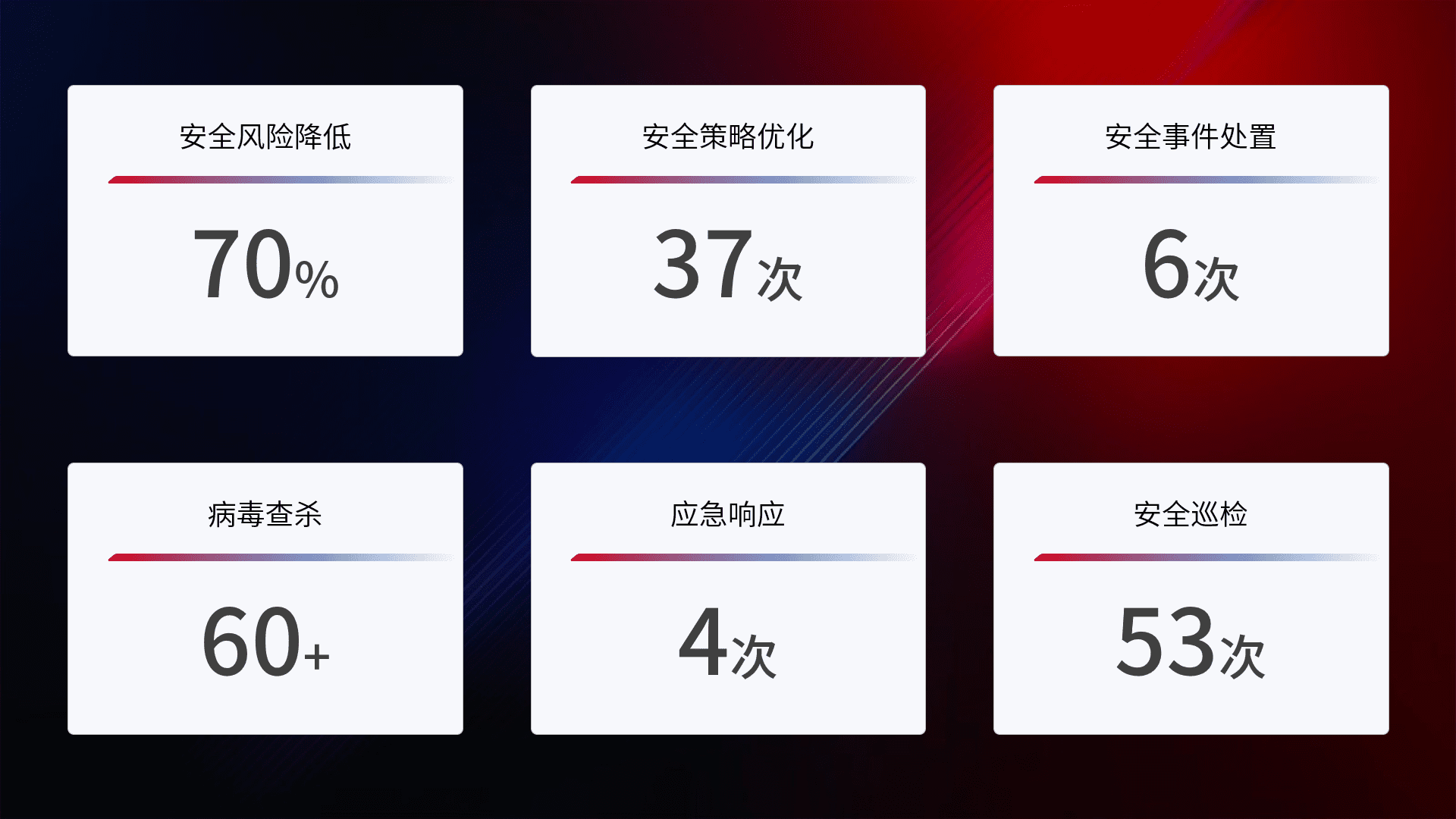 提供全面的安全事件报告体系,,,包括处置报告、、、、周报、、季度和年度总结,,,结合持续监控,,,帮助客户深入了解网络安全状况。。