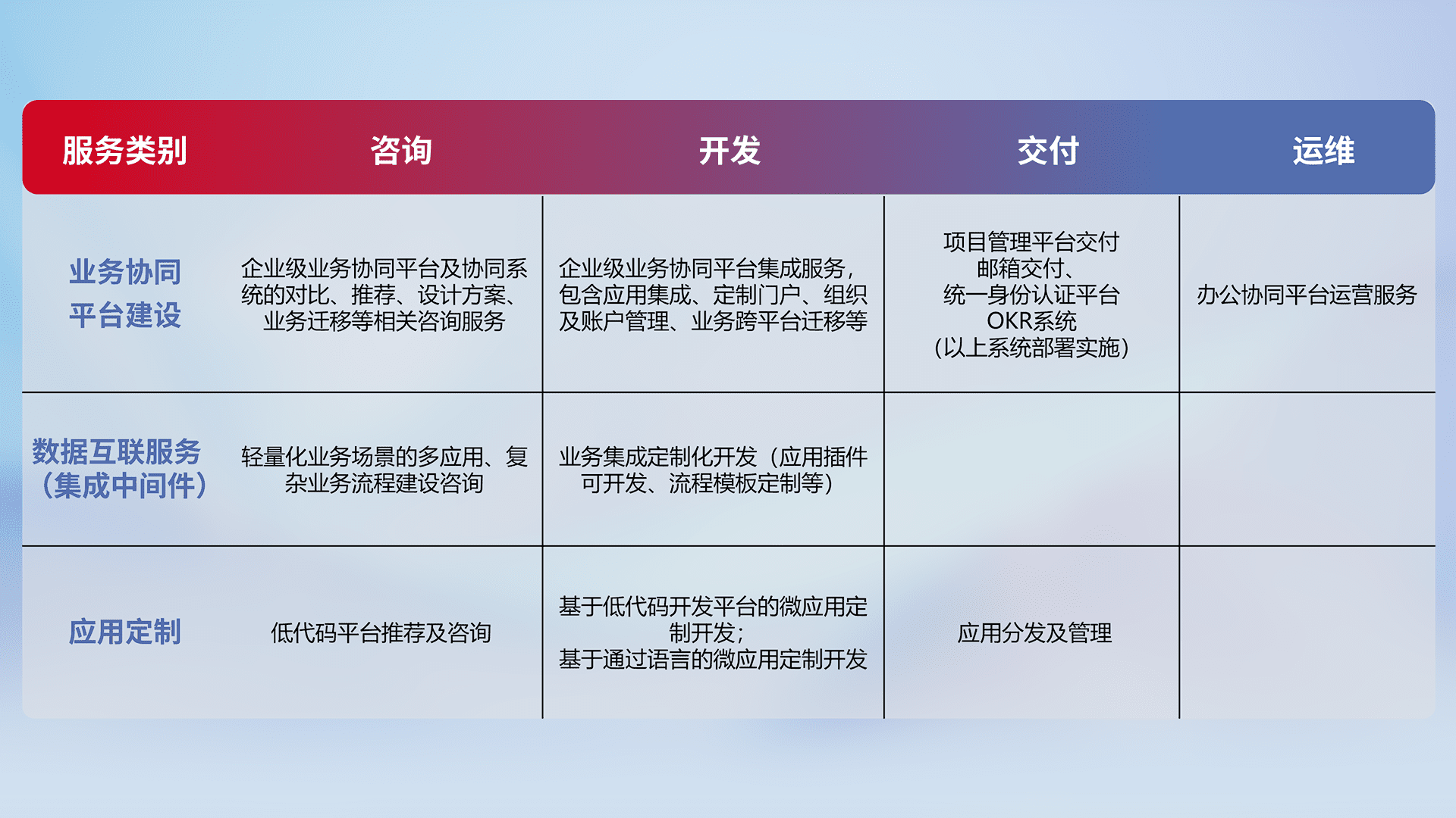 针对钉钉、、、、企微、、、、IDaas等平台级产品提供产品的规划、、、方案、、交付、、、、定制化开发等服务,,,实现如统一协同办公、、智能客户服务、、、混合会议管理、、智能数据查询、、等业务场景,,实现数字化转型。。。。